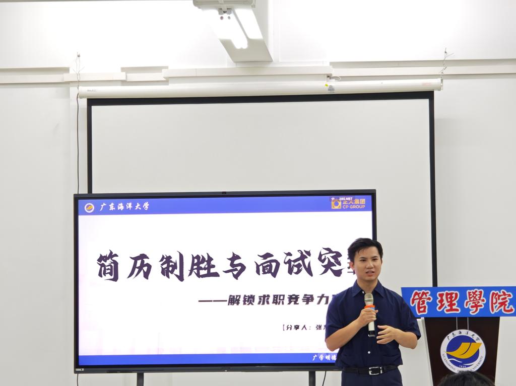 10月31日晚,正大集团广东湛江&海南区人力资源总监助理、正大食品(广东)有限公司人力资源主管,管理学院2017级行政管理专业校友张东炫应邀到博文楼D311会议室开展主题为“简历制胜与面试突围—解锁求职竞争力密码”的就业指导专题讲座。管理学院党委副书记曾艳芳、毕业班辅导员及2026届毕业生等50余人参加活动。