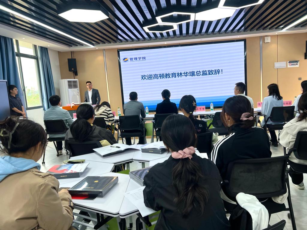 合作企业代表高顿教育集团华南区区域总监林华壤先生则从行业视角分享了他的体会和见解。他首先对广东海洋大学管理学院前瞻性的育人视野表示赞赏。林总监指出,随着中国企业“走出去”的步伐加快,人工智能的发展崛起,熟悉国际财务报告准则、具备跨文化沟通能力、熟练使用各项财务工具的ACCA持证人正成为人才市场上的“稀缺资源”,职业发展前景极为广阔。他表示,作为合作伙伴,高顿教育集团将不遗余力地提供优质的课程资源、资深的讲师团队和完善的学员服务,“我们将与海大管院携手,共同搭建一座连接校园与职场的坚实桥梁,帮助同学们不仅通过考试,更能提升实战能力,无缝对接未来名企的高标准要求。”