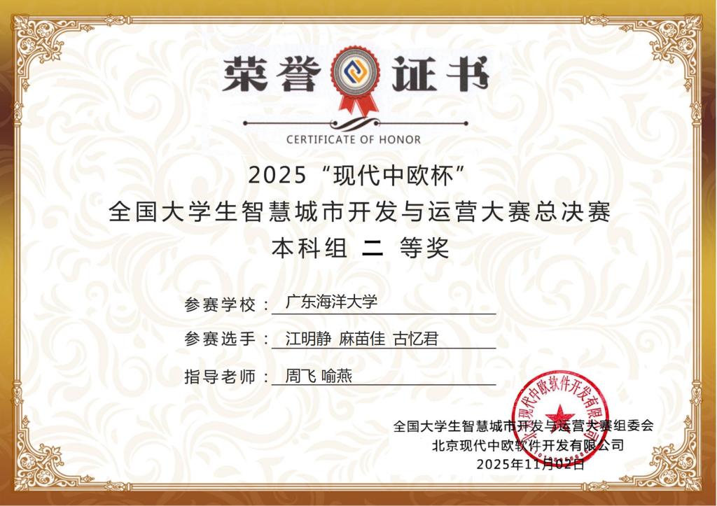 11月1日,由全国大学生智慧城市开发与运营大赛组委会、北京现代中欧软件开发有限公司主办的2025“现代中欧杯”全国大学生智慧城市开发与运营大赛总决赛在线上举行。共有55所高校的165支队伍晋级全国总决赛。我校参赛队伍在比赛中表现出色,荣获本科组二等奖。